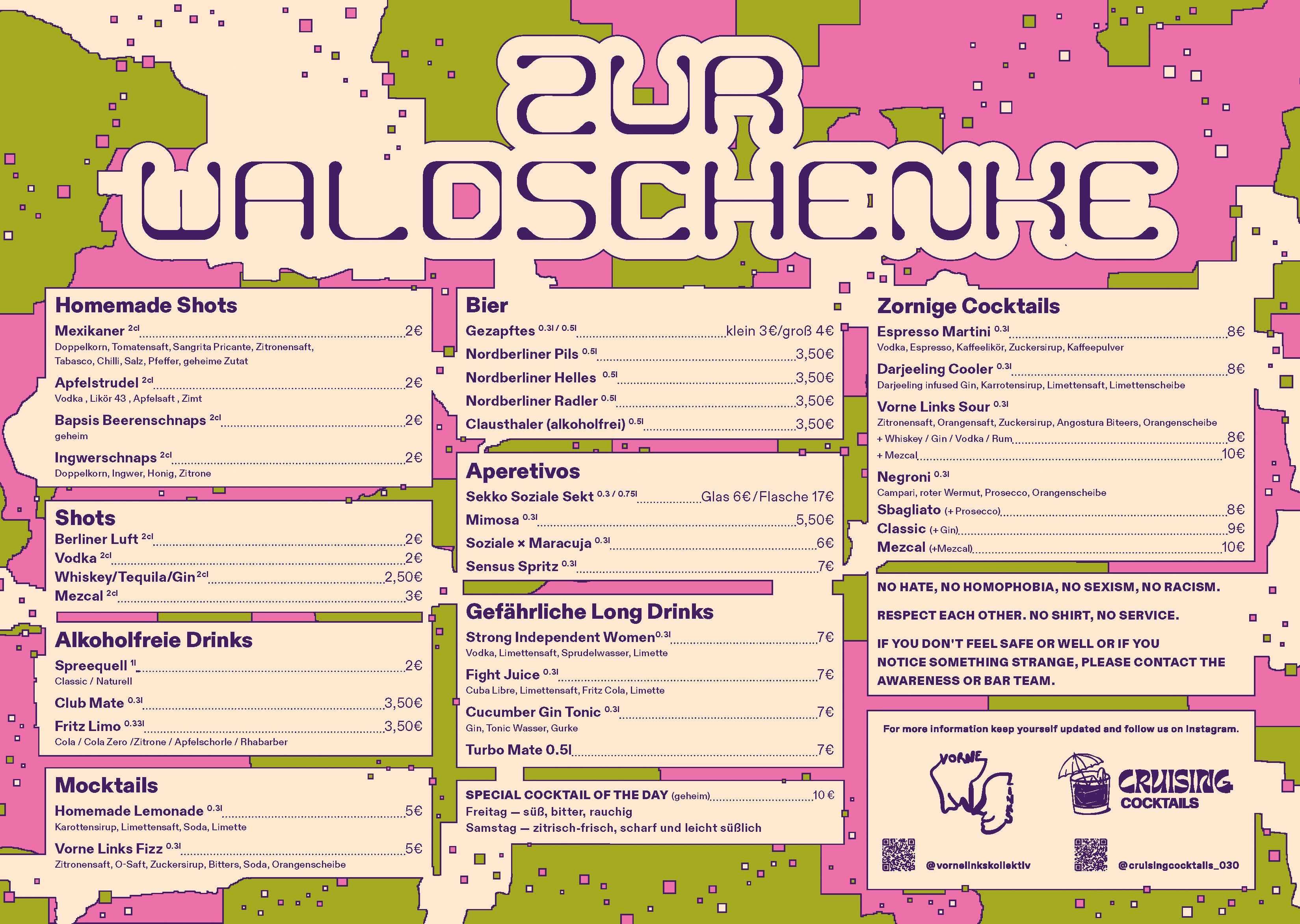 Design einer Getränkekarte und Special-Drink Plakaten für das Vorne Links Kollektiv aus Berlin für das Sensus Festival 2025. Illustrationen auf Plakaten in Zusammenarbeit mir Alex Klette. Quelle 2.Foto Instagram: @sensus.festival